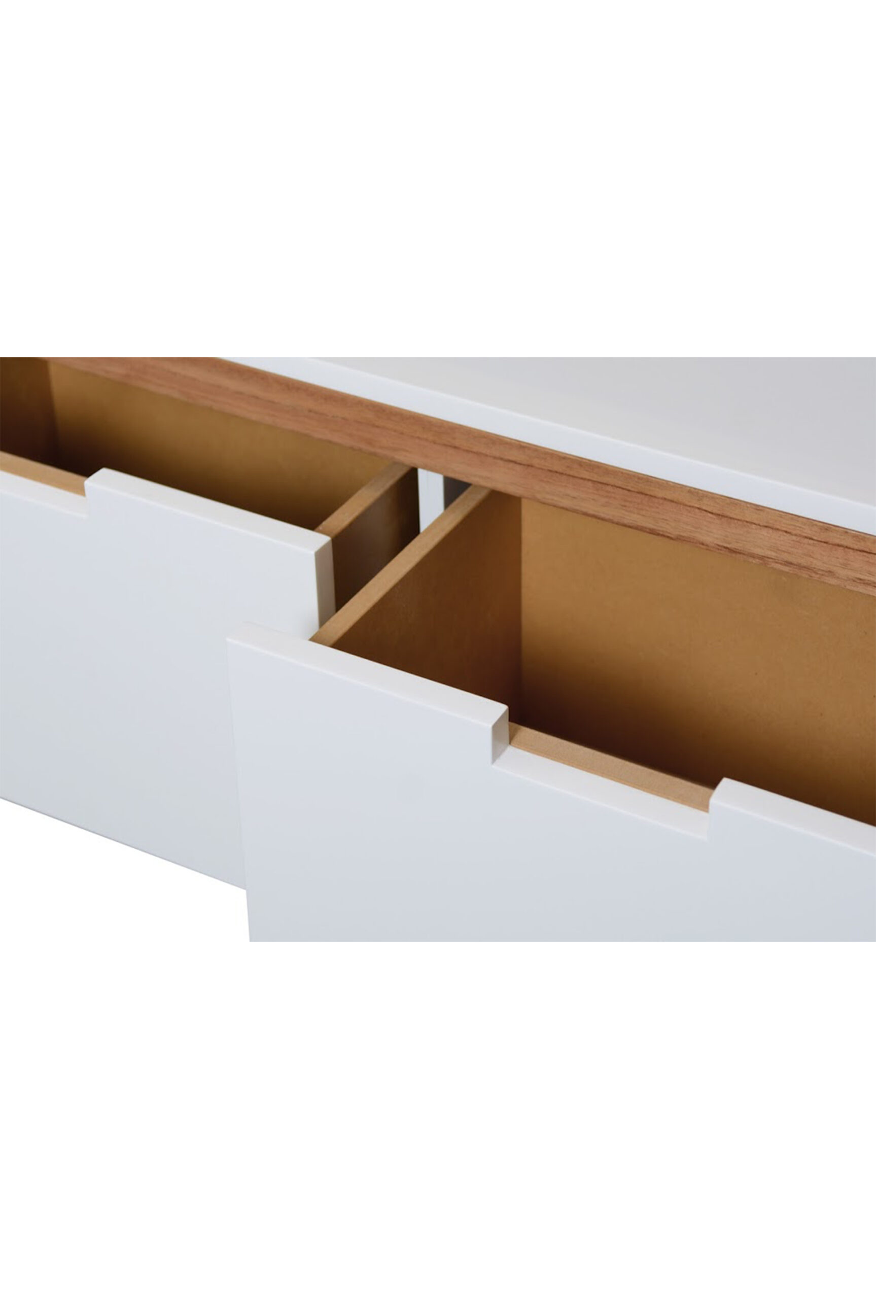 Cajones laqueados en blanco semi-mate con correderas telescópicas.